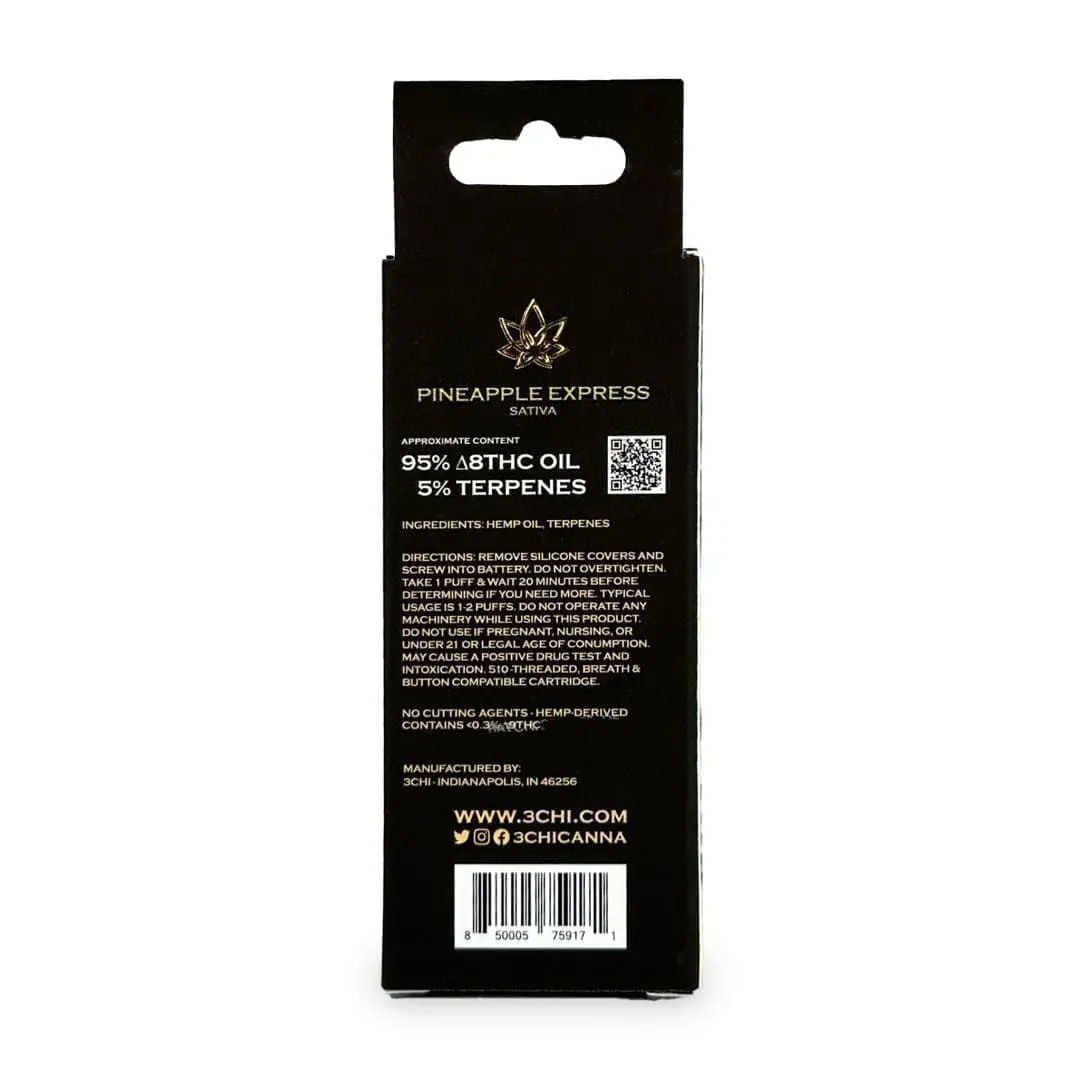 The 3Chi Delta 8 THC Vape Cartridge with Botanical Derived Terpenes – Pineapple Express has an unbeatable uplifting feel and contains 95% Delta 8 THC (Δ8THC) oil. It is derived from hemp, and comes in a glass CCELL cartridge with a ceramic core and mouthpiece for the best possible performance and taste. Natural Botanical Derived Terpenes are used for flavor. Breath and button-activated. Must be used with a 510 compatible battery. Browse our collection of vape pen batteries.