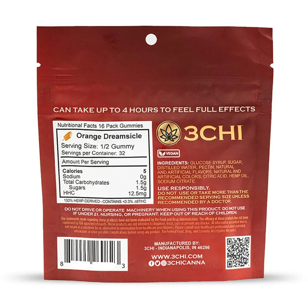 The 3Chi HHC Gummies – Orange Dreamsicle are a potent Hexahydrocannabinol gummy containing 25 mg of HHC per gummy. Each package contains 16 pieces, for a total of 400 mg of HHC per package. Like a dream….these orange flavored gummies will satisfy your citrus desires. Consumers report that HHC offers a relaxing feeling similar to Delta 9 THC, without the sluggish couch-lock side effect and may have a more social effect. Most HHC consumers report a great mental and body feeling with little to no drawbacks.