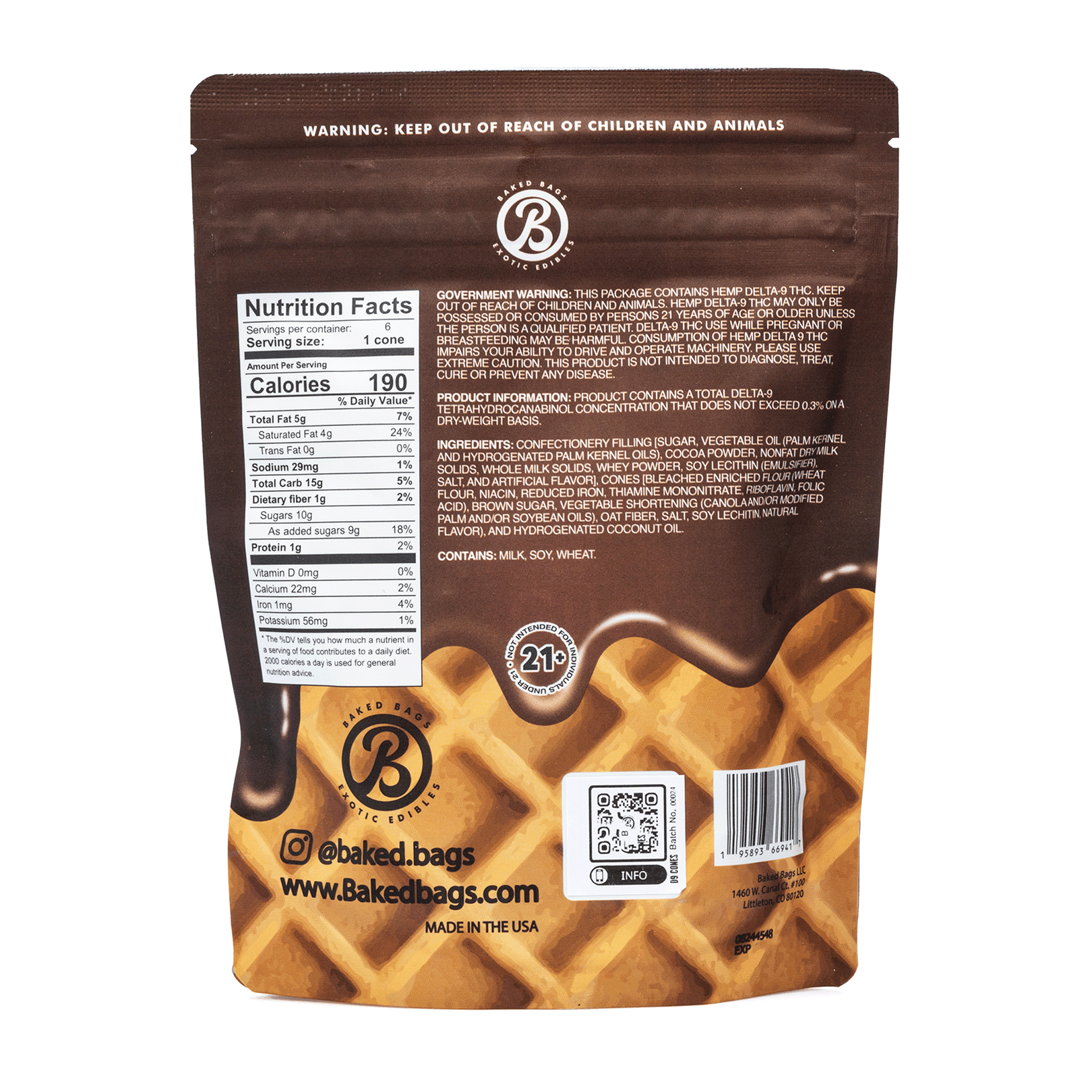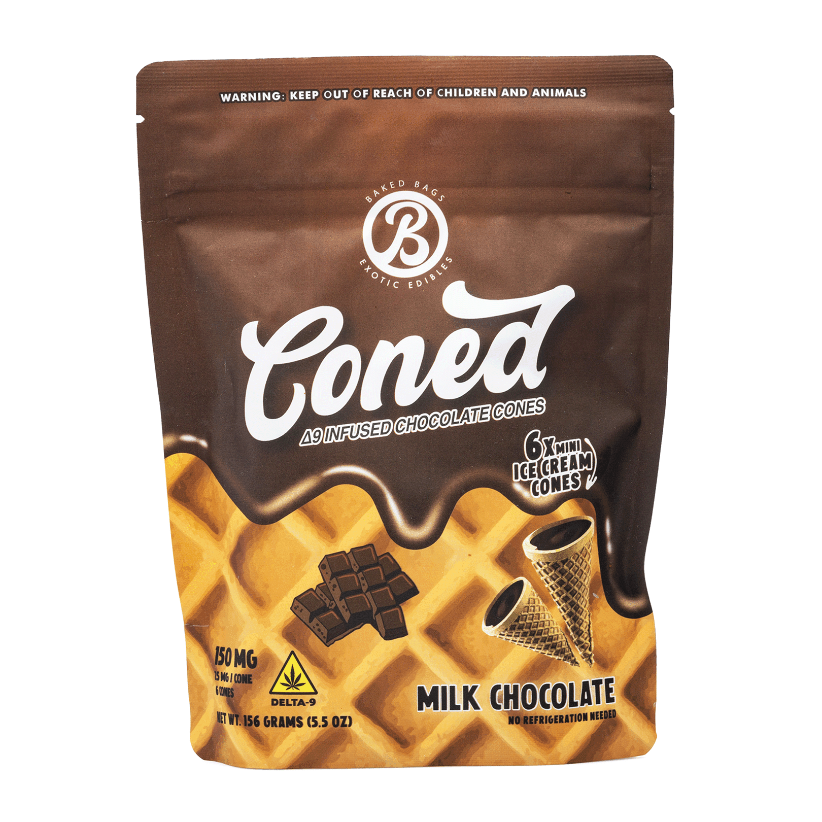 A rich oasis of relaxation awaits in every bite of Baked Bags Delta 9 THC Coned – Milk Chocolate. This decadent and creamy Delta 9 delight coats taste buds with milk chocolate goodness while being wrapped in a tasty ice cream cone. Only 190 calories and 11 grams of sugar make each Coned bite the best treat to satisfy a chocolate craving.