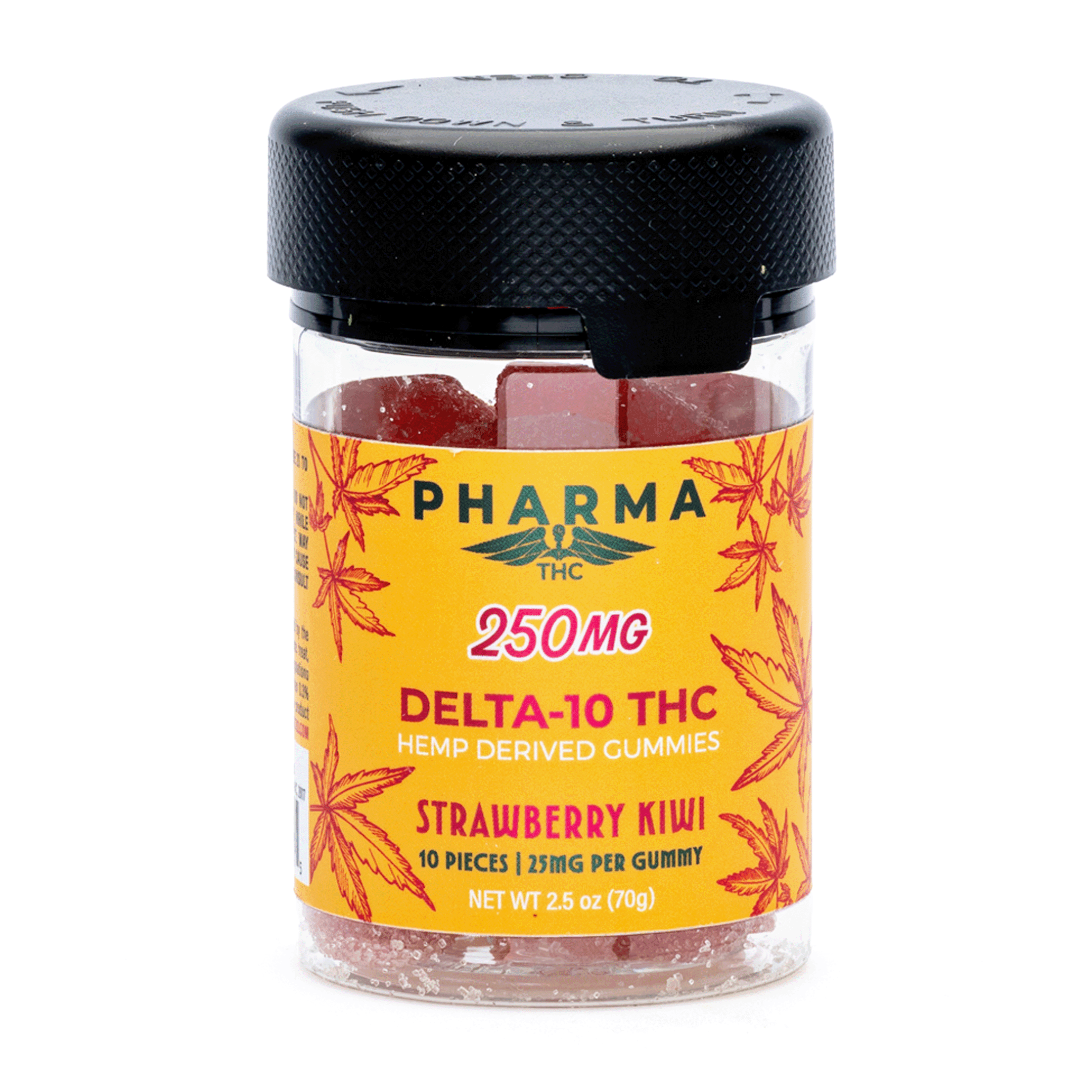 The PharmaTHC Delta 10 THC Gummies – Strawberry Kiwi (250 mg Total Delta 10 THC) are the perfect gummy if you are looking for a more mild, less potent cannabis experience that won’t send you to the moon. These gummies are less intense than Delta 8 THC, but can still give you an uplifting kiss of energy. They are a great choice for people looking for a slightly deeper experience than what CBD can offer, but may just not be ready for the heavy punch of Delta 8 or Delta-9. For a change of pace on a dull day, these gummies might just be the little bit of sparkle you need! These delicious gummies will remind you of summer with their juicy, fresh strawberry-kiwi flavor. Each gummy contains 25 mg of Delta 10 THC, and each package contains 10 gummies, for a total of 250 mg.